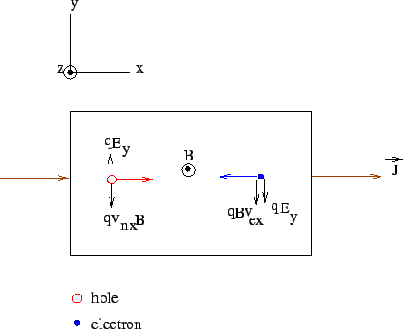 When both electrons and holes are present, they drift in opposite directions. with holes moving in the direction of current and electrons in the opposite direction. As the sign of their charges are opposite, the Lorentz force acting on them will be in the same direction. Thus both the carriers are deflected towards the same side and they pile up along one of the edges. As there is no closed path for current to flow in the y-direction, the sum of the electron and the hole current in the y-direction must be zero |