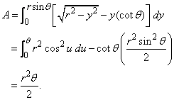 Compute the area A of the sector of a circle of radius marked by the points where is fixed. This area can be regarded as the area of the region bounded by the curves
