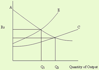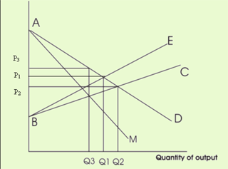 There are costs borne by the producers and they do not involve externalities. BE represents the original social costs of production. In addition to marginal private costs, these costs include marginal costs to the society caused by pollution. AD represents the demand curve for the commodity. It shows the price which buyers are prepared to pay for the various quantities of the commodity.