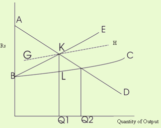 Pigou (1932) 1 suggests that the excess production of the commodity can be reduced to the socially desirable level by imposing a suitable tax on the commodity (see Fig. 2). If Rs. KL per unit tax is imposed on the commodity, the marginal (private) costs curve will shift upwards by a vertical distance of Rs. KL. The marginal (private) cost curve with tax will be GH. The output produced in the industry will now be Q 1, which is the socially desirable level of output as discussed earlier.