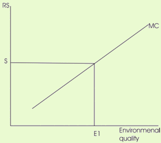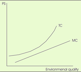 The slope of TC curve at any given level of environmental quality gives the marginal cost of pollution abatement (shown by MC curve). The marginal costs of pollution abatement rises with improvement in environmental quality because as discussed above, higher levels of emission control can be achieved only at higher costs.