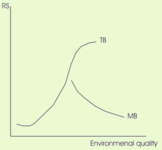 The total benefits of pollution abatement. In the beginning small reductions in emission of pollutants gives rise to substantial benefits. However, after the first improvements, the total benefits increase at decreasing rates. The slope of TB curve gives the marginal benefit (MB) curve. As shown in the figure marginal benefit of pollution abatement declines as the environmental quality improves.