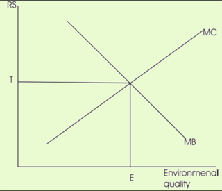 The efficient level of environment quality (E) could be achieved by imposing a tax of Rs. T per unit of pollutant emitted. If it is cheaper to reduce emission of pollutants than paying taxes, the polluters would choose the former. In other words as long as the marginal cost of pollution abatement is less than the tax (per unit) on the emission of pollutants, it would be advantageous for polluters to reduce their emissions. On the other hand, if the marginal cost of pollution abatement is higher than the per unit tax on the emission of pollutants, polluters would prefer to pay taxes. The equilibrium would be reached at E* which is the socially optimal level of emission of pollutants. Coase (1960) has suggested another method, which could be used to achieve the desired objective. In this method, the sufferers (i.e., the parties damaged by pollution) pay (bribe) polluters to reduce their level of pollution. This is, however, not only difficult to put in practice but is also ethically unjustifiable.