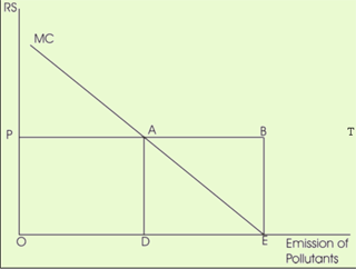 If polluters are paid a subsidy of Rs T per unit on reduction of emission of pollutants, then they would reduce emissions by DE amount. This would cost them area ADE. They would, however, receive subsidy-given by area ADEB. Their net gain is then given by area AEB.