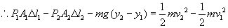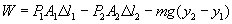 The work done by the pressure force P1A1 on the system is P1A1 and the work done on the system by the pressure force P2A2 is -P2A2 .The negative sign implies that the work done is done by the system. The work done on the system by gravity is -mg(y2. y1). Here also it is negative, because the work is done by the system against the gravity. The total work done on the system,