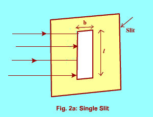 Consider a single slit Fig. 2a(a rectangular aperture, whose length is larger compared to its breadth, and breadth is quite narrow, comparable to the wavelength of light 0.1 mm for visible light) placed in front of a monochromatic light source as shown in figure 2(b).