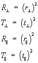 | These four equations are called as Fresnel's equations and can be obtained by solving the wave propagation equations under the appropriate boundary conditions ((Ref: D.J. Griffiths, Introduction to Electromagnatics, Prentice Hall(1995). ). The ratio of corresponding reflected (transmitted) intensity to the incidence intensity is called as the reflectivity (transmittance) for the interface. Thus, |