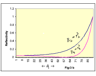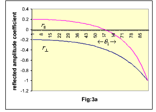 1.Brewster's angle:The Fresnel's equations eqs 1-4 tell us the variation of amplitude coefficient fro reflected and the transmitted ray for the given interface. The amplitude reflection Coefficient for the air –glass interface as a function of angle of incidence is shown in fig 3(a) for both the s polarized (perpendicular component) as well as p polarized (parallel component) wave. The corresponding reflectivity is shown in fig 3(b). Here air is taken as the first medium with refractive index n 1 =1 and the glass as the second medium having refractive index n = 1.5 .