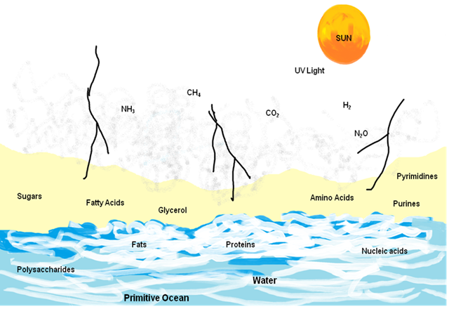 (2) Spontaneous formation of monomeric organic compounds: The simple molecules interact with each to form simple monomeric organic compounds. These molecules were sugar, fatty acids, glycerol, amino acids and organic bases (purine/pyrimidine). The reactions between the inorganic to give simple organic molecules occurs in reducing environment inside ocean. The inorganic molecules were condensed in the form of rain as temperature of earth lower down. Hence, both inorganic compounds and simple organic compounds were present in the primordial ocean.