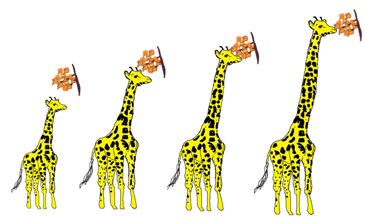 1. Giraffe: Lemarck uses his hypothesis to explain the appearance of Giraffe with long neck and forelimbs. The different evolutionary stages of present giraffe is explained as per lemarck theory in figure 7.1. As per the theory, the giraffe is evolved from the short height deer like ancestor. These ancesters are living in the barren place with leaves on the trees available to them for eating. In order to reach the leaves on tree, it streacted its neck and forelimbs. As a result, these organs get elongated. These acquired character in first generation passed on to the subsequent generation and continuous streatching accumules this character over the course of few generations to evolve giraffe with long neck and forearms.