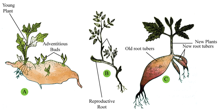 (A) Roots: The modified root planted in soil develop shoot from the bud present on root and adventiuos root at the base to give rise new plant (Figure 19.1). Ex. Sweet potatos, Topioca, Yam, Dahila and Tinospora.