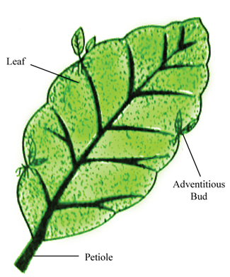 (E) Leaves: Some plant develop adventitious buds on their leaves and these leaves buds off and give rise to new plants (Figure 19.3). For ex. Bryophyllum, developes several small planets with root on the margin of leaves (Figure 19.3). In few cases, develops bud when get injured and placed on the moist soil. Ex. Kalanchoe, Begonia, Streptocarpus etc.