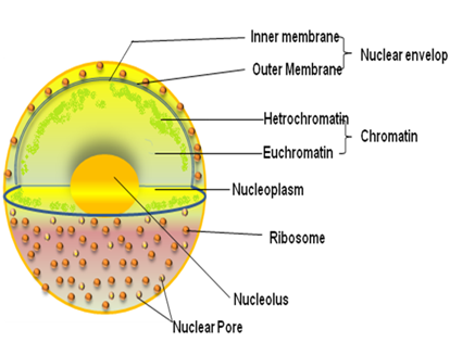 2. Nucleus-Nucleus is the central processing unit of cell and homologus to the processor in a typical computer (Figure 22.2, A). The liquid filled inside nucleus is called as nucleoplasm. It is a viscous liquid containing nucleotides and enzymes to perform replication, transcription, DNA damage repair etc. It contains genetic material (DNA) in a complex fashion involving several proteins (histones) to pack into nuclear bodies or chromosomes. The chromatin in eukaryotic nucleus is divided into euchromatin or heterochromatin. Euchromatin is a part of chromatin where DNA is loosely packed and it is transcriptionally active to form mRNA where as Heterochromatin is more densily packed and it is transcriptionally inactive. Nucleus in eukarytotic cells are present in a double layer of membrane known as nuclear envelope (Figure 22.2, B). Outer membrane of nuclear envelope is continuous with the rough endoplasmic reticulum and has ribosome attached to it. The space between two membrane is called as perinuclear space. Nuclear envelope is often has nuclear pore and as per calculation an average nucleus has 3000-4000 pores per nuclear envelope.