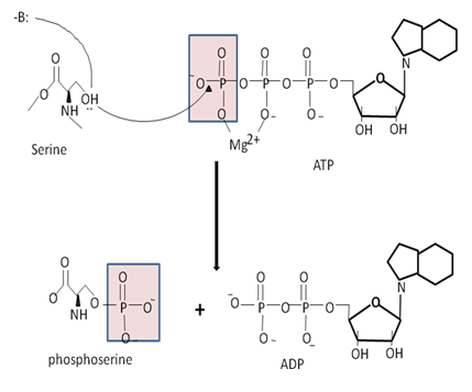 on the universal phosphoryl donor adenosine triphosphate (ATP) serves as the point of nucleophilic attack from that -OH group, which results in the transfer of the phosphate group to the amino acid side chain.Magnesium (Mg2+) ions acts as catalyst by chelating the γ- and