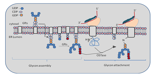 Glycan attachment: The pre-assembled glycan is attached to newly formed polypeptide chain via enzyme oligosaccharide transferase (OSTase). OSTase looks for consensus sequence Asn-X-Thr/Ser, where X may be any amino acid except proline. Once it is recognized then 14- mer precursor glycan is attached to carboxamido nitrogen on Asn of the developing polypeptide chain. β-OH group of serine and threonine residue acts as hydrogen bond donor for the reaction. Here in given figure we are discuss about the diagrammatical arrangement of glycogen arrangement. Glycan synthesis starts at the cytosolic face of the ER and when the structure is flipped into the ER lumen then it completed. Now OSTase enzyme transfer the precursor glycan to the Asn residue on the nascent protein as we discuss in given Figure 31.3.