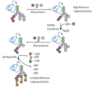 Glycan maturation in the Golgi: In golgi bodies both trimming and addition of sugar molecules takes place which generates diversity in glycan structure of glycoproteins. Up to previous step of trimming in ER, glycan structure of all proteins is same. In golgi bodies, each cisternae carries specific enzyme and step-wise processing occurs. The ultimate glycan structure can be majorly classified in two catagories. Complex oligosaccharides – contain multiple sugar types.