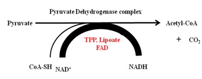 Production of Acetyl-CoA: it is a oxidative decarboxylation from pyruvate to release CO2 and generation of acetyl coA and reducing equivalent NADH. It is an irreversible reaction catalyzed by pyruvate dehydrogenase complex. Similar to glycolysis, irreversible decarboxylation commits the pyruvate for kreb cycle. In addition, acetyl-CoA is the reaction intermediate in fat metabolism and works as feeder point for kreb cycle (discussed more later).